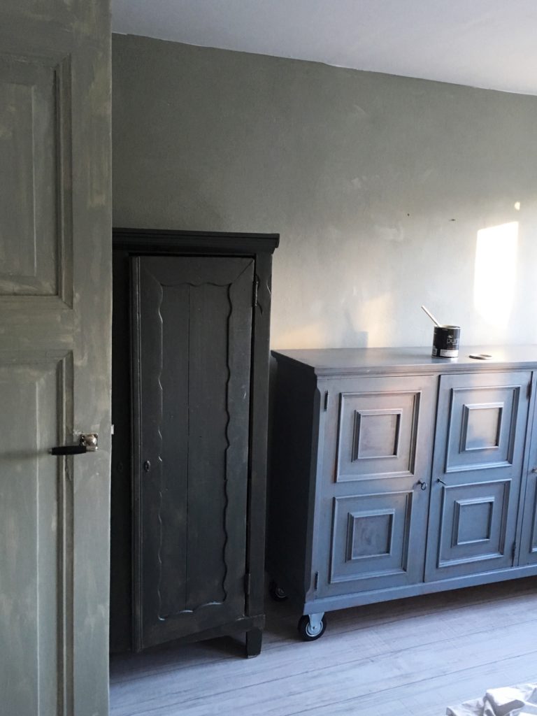 Mijn hart maakte een sprongetje toen ik hoorde dat Pure by Flexa ColorLab nu ook beschikbaar is in krijtverf. Ik vind de matte, poederige uitstraling van krijtverf echt heel prettig en rustig. Dat moest in ieder geval de verf worden voor de muur & voor ‘de nieuwe’ oude deur in onze slaapkamer. Want krijtverf kun je zowel toepassen op de muur als op hout en door zowel de deur als de muur in dezelfde verf te verven ontstaat weer meer rust in de slaapkamer. Dan nog de missie om een mooie kast te vinden. Bij de kringloop heb ik een prachtige oude servieskast gevonden, die in zijn tweede leven prima dienst kan doen als kledingkast. Deze kast heeft veel schappen en is daarom zeer geschikt om als legkast te kunnen dienen, missie geslaagd!