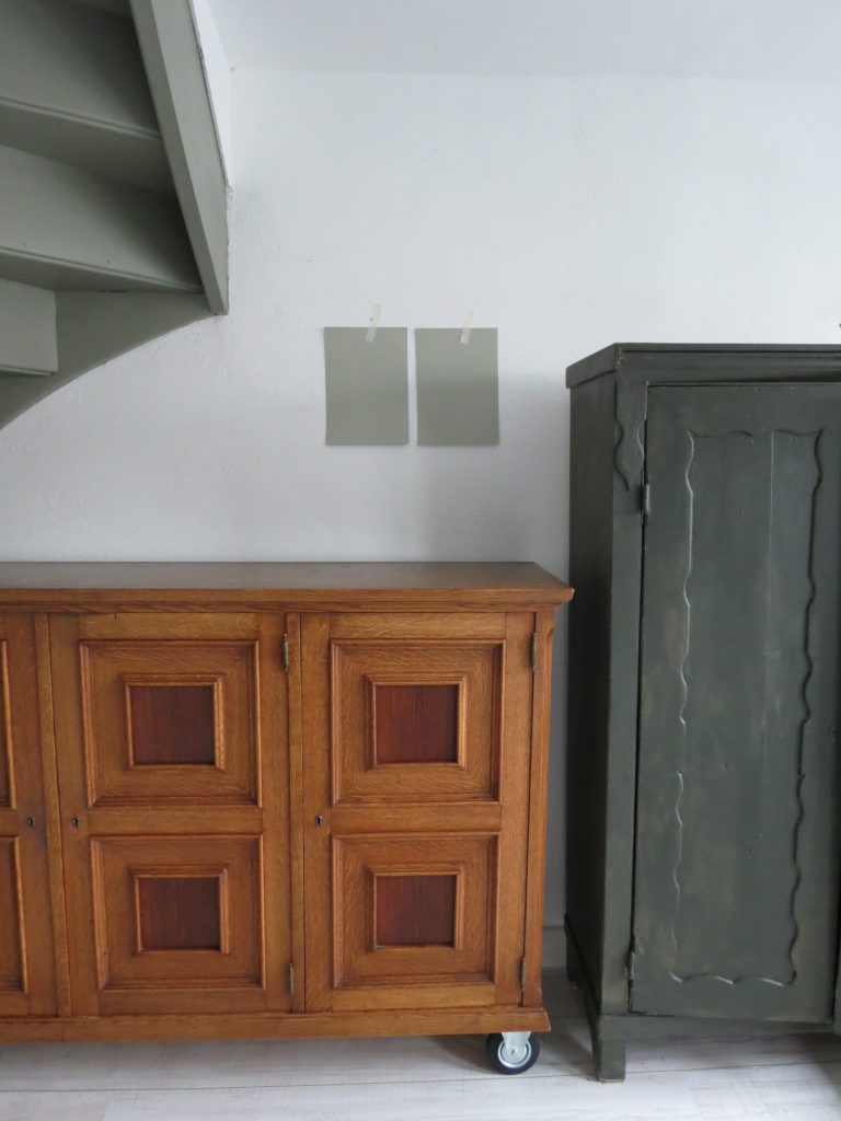 - De kleur Mild Tundra getest op de kast d.m.v. de kleurstalen.