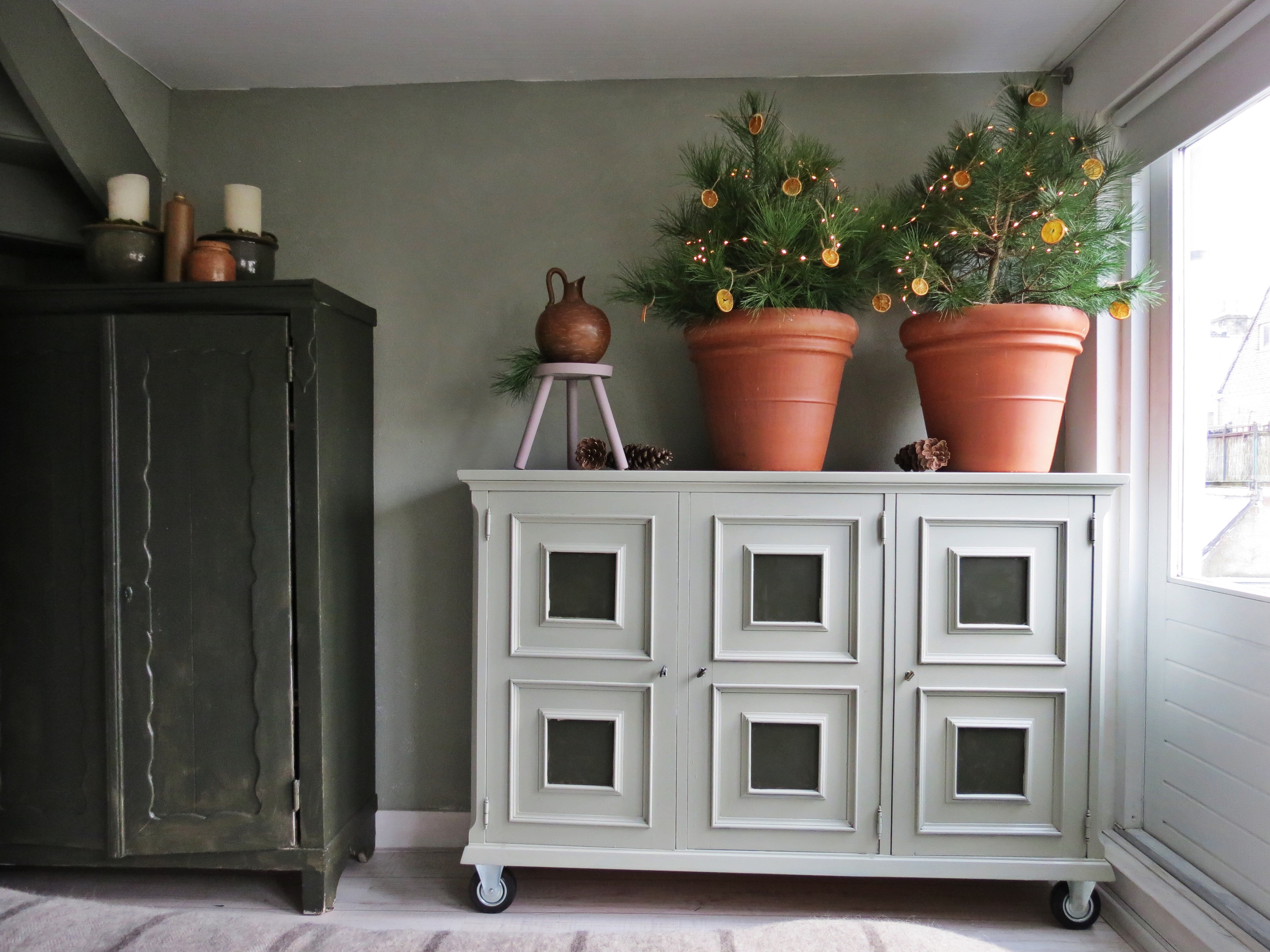 Om de kast aan te laten sluiten bij ons interieur en bij het jaar 2017 heb ik het onderstel van de kast vervangen door wielen, waardoor het ook nog eens makkelijk stofzuigen wordt.